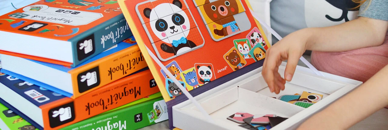 Magnetisches Buch - TiereMagnetisches Lernspiel aus Karton zum Thema Tiere Es besteht aus 30 Magneten und 10 Karten. Sobald das „Buch“ geöffnet ist, besteht das Ziel darin, dank der Magnete auf der Tafel das gleiche Tier wie auf der Karte zu erstellen. Das Kind kann auch verrückte Tiere erstellen, i..