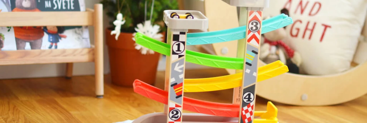 Ein akustisches Spielzeug und eine Kugelbahn in einem
